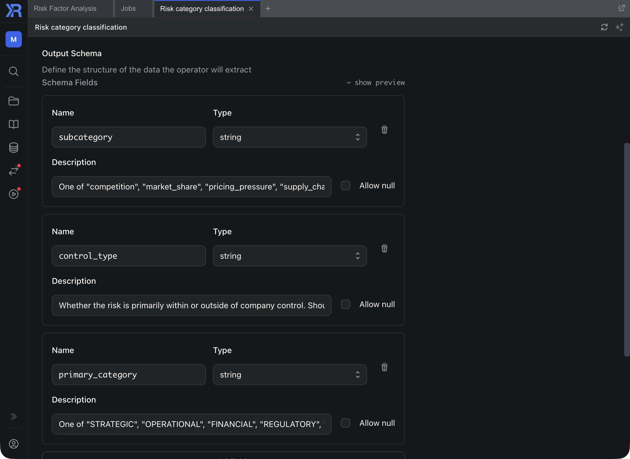 Each operator is an AI agent with a defined data contract: what it receives, what it produces, validated against JSON Schema. Classify documents, extract structured fields, identify risk factors, or define domain-specific extractors. Each operator sees exactly one document and one task. Narrow context by design: the model's attention isn't diluted by irrelevant information. You define the analytical task; Ragnerock enforces the contract.